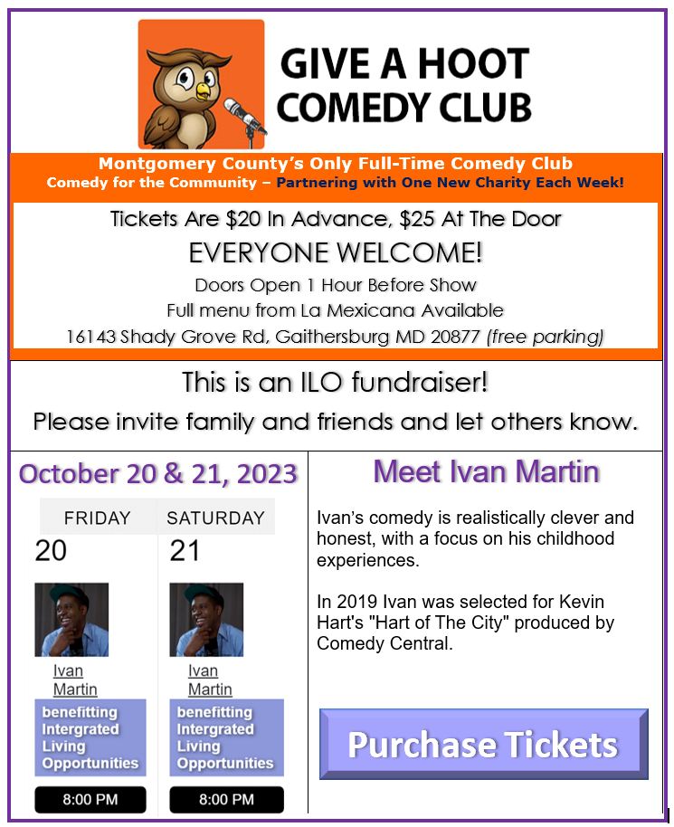 Please help us with our upcoming fundraiser at Give-A-Hoot Comedy Club in Rockville on Friday and Saturday night, October 20 and 21. A fun time for a great cause. Please join us and invite your friends and family. Open to everyone. Details below.
